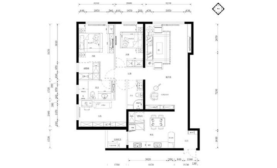 客廳:主要原有電視背景墻凹進一塊,電視墻狹小問題,通過裝飾手段把背景拉伸