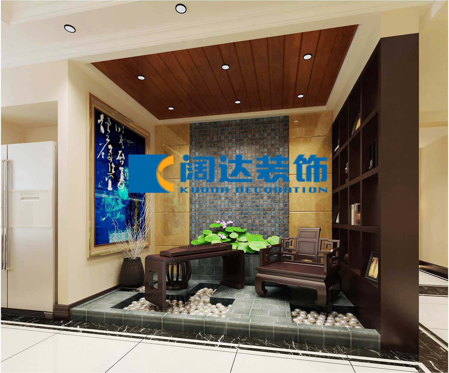 以現代的裝飾手法和家具,結合古典中式的裝飾元素,來呈現亦古亦今的空間氛圍。中式風格的古色古香與現代風格的簡單素雅自然銜接,