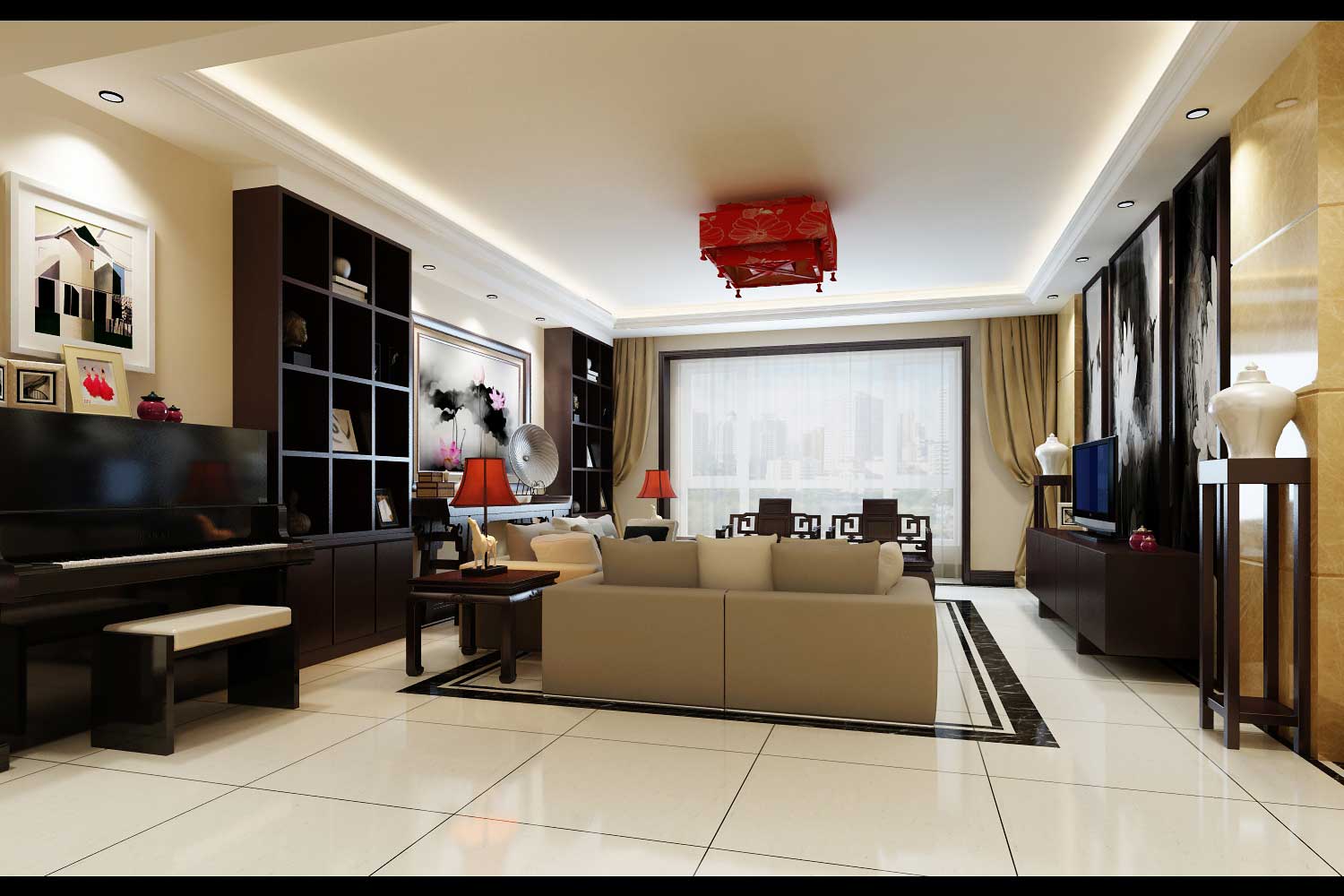 空間上講究層次,多用隔窗、屏風來分割,用實木做出結實的框架,以固定支架,中間用欞子雕花,做成古樸的圖案。門窗對確定中式風格很重要,用實木雕刻,打磨光滑,富有立體感。客廳是傳統與現代居室風格的碰撞,