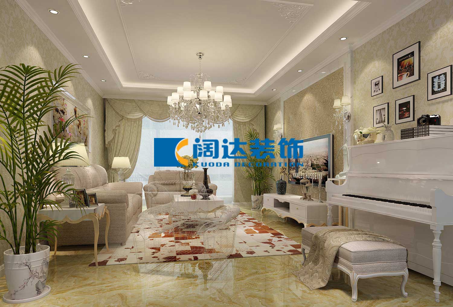 客廳設(shè)計采用整體白色調(diào)為主,以大理石、淡啡色墻紙做主要裝飾,白木線及灰色鏡面作點綴,筆直簡約的線條同樣能勾勒出豪華時尚的氣息。