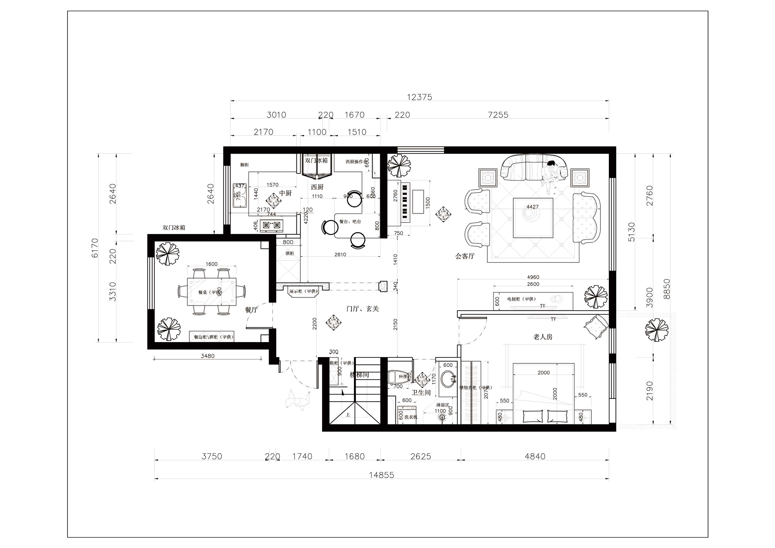 本案例業主是事業有成的一家三口,小區環境十分優美,緊鄰百望山,戶型空間十分敞亮、明快。但此戶型擺在我面前的最大問題是入戶門廳太大,空間浪費明顯、及臥室房間不夠用等。因此在設計上首先要解決空間布局的問題,首先增加門廳玄關位置,擴大中西廚面積,其次在一樓增加老人房解決房間較少的問題。