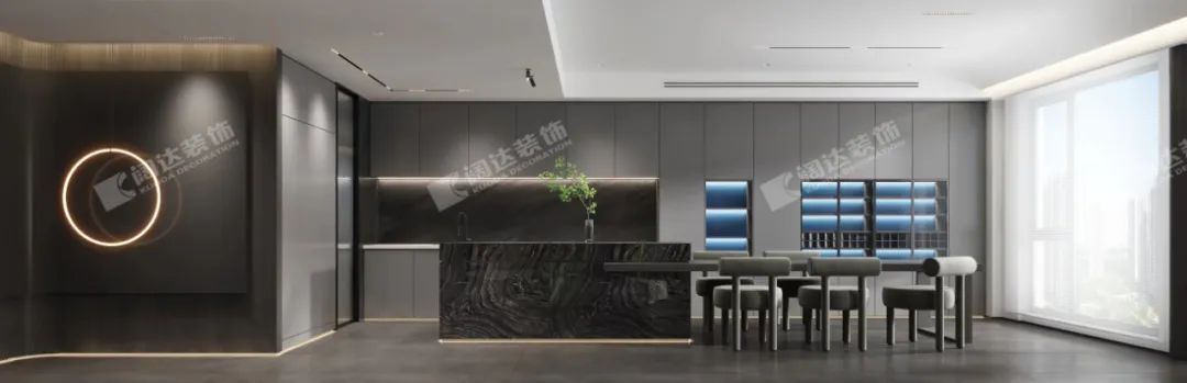 將廚房與餐廳打通,視覺上連為一體,前后呼應(yīng),中島式的設(shè)計(jì)在餐廳增添了社交趣味的同時(shí),又考慮了餐廳的儲(chǔ)物收納。大理石與趣味雕塑相遇,在下照燈的光影下,呈現(xiàn)出塊面的立體感,傳達(dá)著亙古不變的高級(jí)與時(shí)尚。落地窗良好的采光和視野,更在這看似低調(diào)的氛圍中,渲染出一層兼收并蓄的微妙氣質(zhì)。