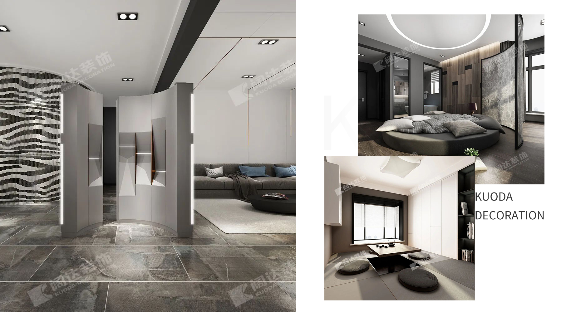 為了滿足業主大淋浴房的需求,客廳做出一個馬賽克飾面弧形墻,在擴大淋浴區面積的同時,形成了一道獨特的風景線。