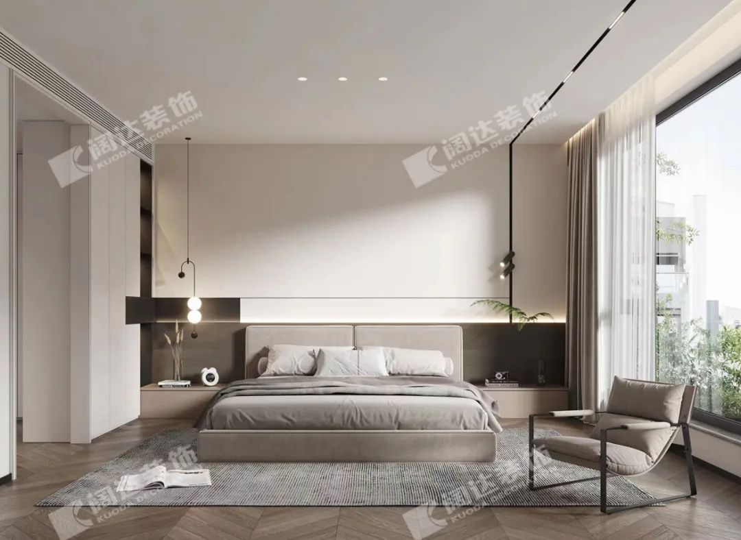 主臥:視覺上的開闊,被光暈染的每個角落,讓人隨心沉浸到自我的空間當中,亮色的家具在白色空間內恰好起到了點綴的妙用。