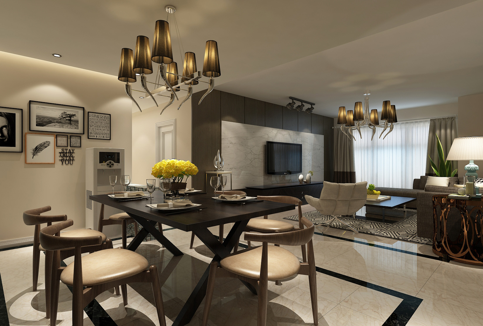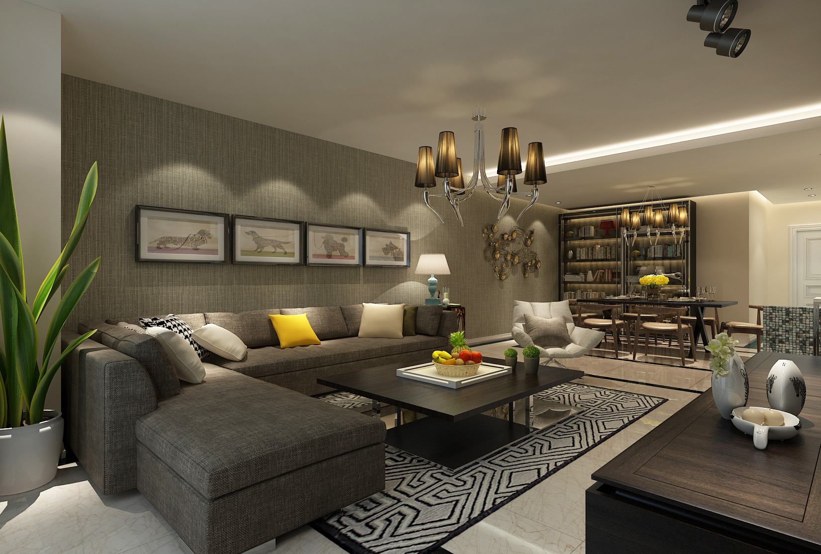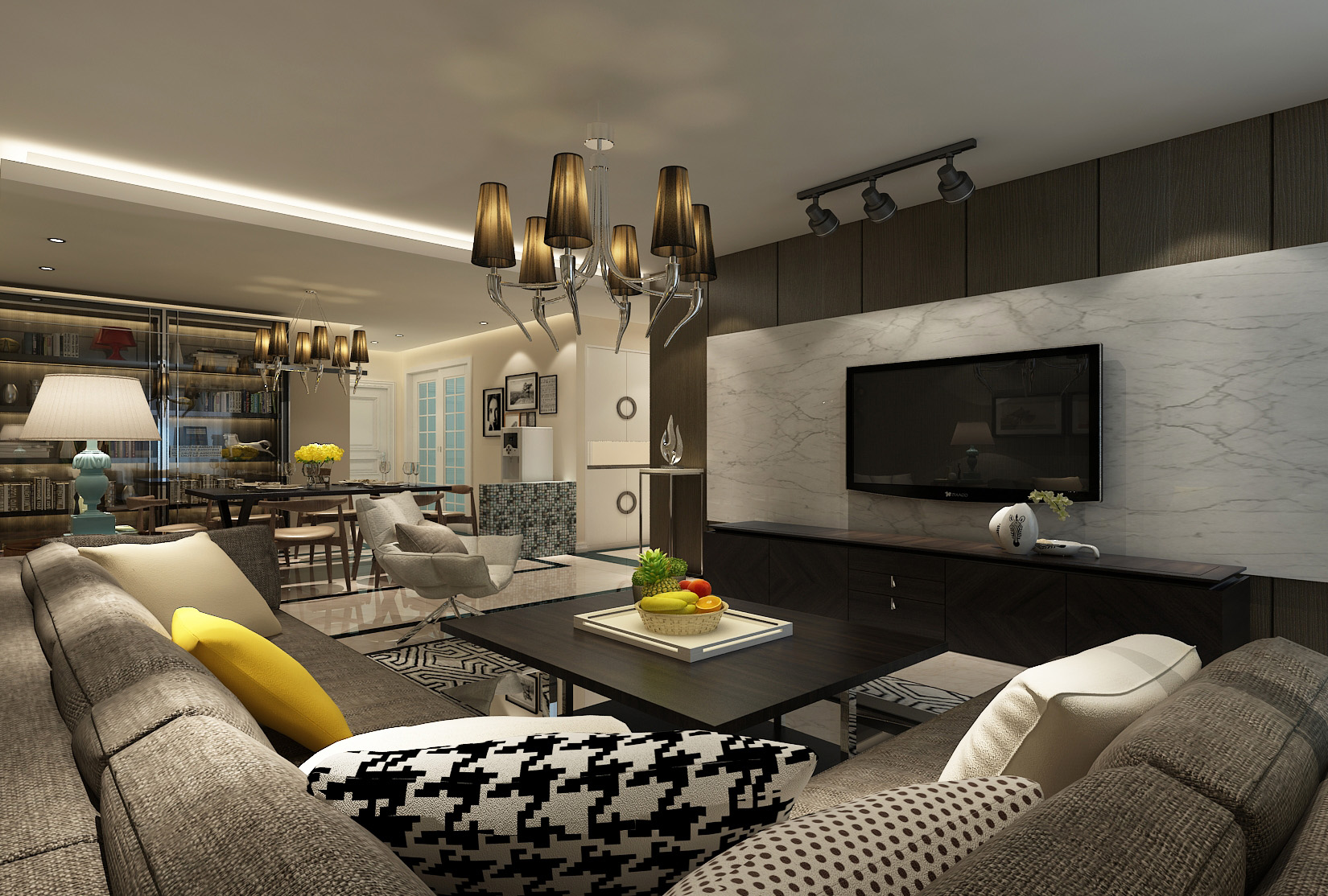 本案中的146平米的三居室整體采用了現代風格裝修,背景墻板與門型采用米白材質,與電視墻外側黑色背景,電視柜桌子、茶幾,形成鮮明對比,輔之灰色點綴,讓整個空間充滿典雅大氣,又不失現代時尚感。燈光多以暖色,給人以溫馨懷抱的暖感,加之白色調相輔相成,營造溫馨的同時又偏于現代生活的明朗。